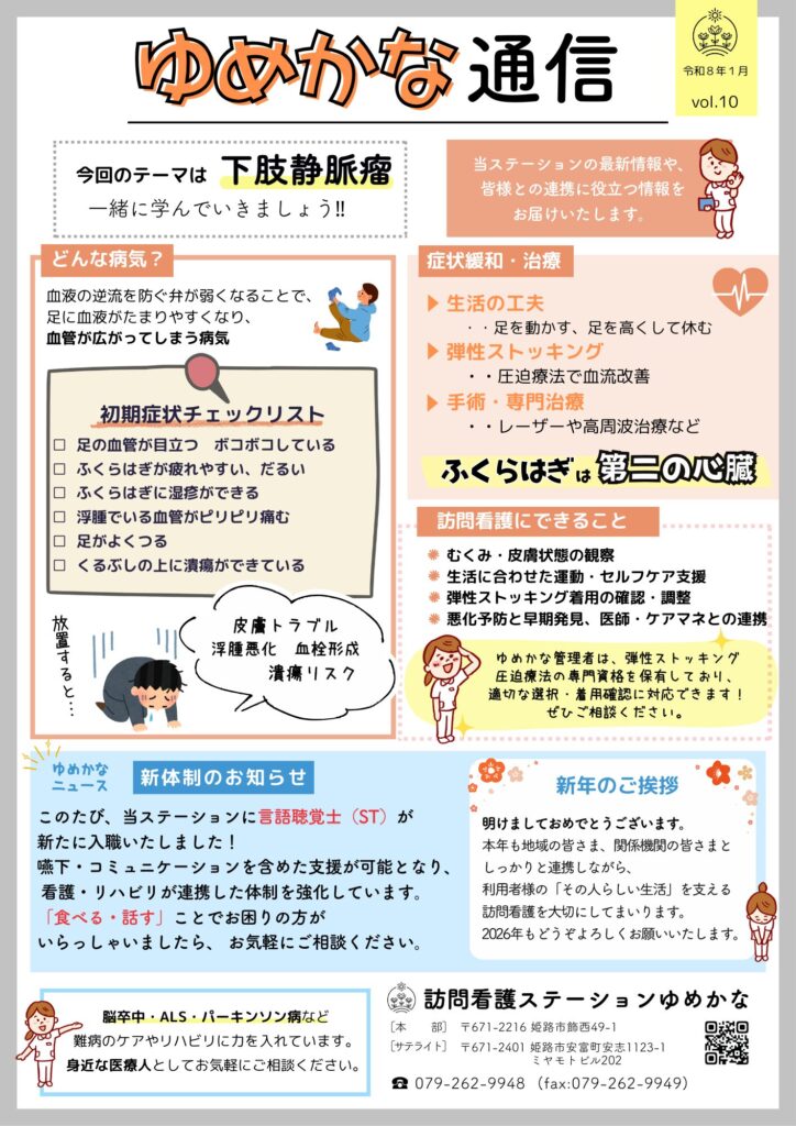月に1回【ゆめかな通信】を作成しております。今回のテーマは「下肢静脈瘤」です。ゆめかな管理者は、弾性ストッキング圧迫療法の専門資格を保有しており、適切な選択・着用確認に対応できます!ぜひご相談ください。